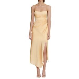 Sophisticated and luxe. Done in a gorgeous yellow hue and asymmetric hem. Gathered waist detail and low cut back.
