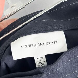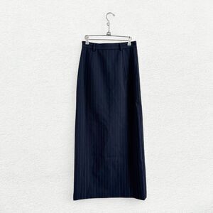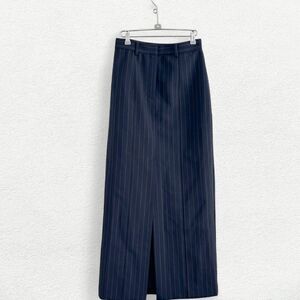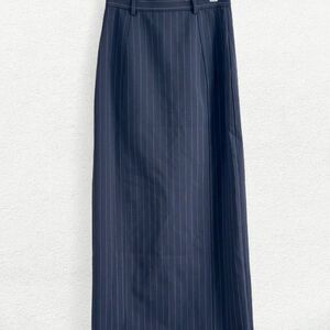 The Significant Other Sinead Skirt in Midnight Pinstripe is a midi-length skirt with a high waist and a center front split, designed with a structured suiting fabrication. The skirt is fully lined, features a front fly closure.