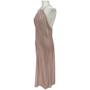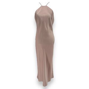 For sale is this Significant Other Vienna Satin Open Back Blush Pink Midi Dress Size US 6 AU 10. This dress is in great condition with a few minor markings throughout. This gown features a high neckline, spaghetti straps, and an open back feature.