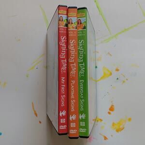 The Signing Time Academy is the educational division of Two Little Hands Productions. Learn sign language, early reading skills, science, manners, and more with Emmy-nominated actress Rachel Coleman. Learn more than 400 ASL signs! Signing helps boost vocabulary, spelling, and reading skills! Videos signing with song that teach reading, science, art, music and empathy. Signing Time Season 1 Video Playlist - English & Spanish options: This set contains a set of 3 Interactive learning media DVDs: Volume 1: My First Signs Volume 2: Playtime Signs Volume 3: Everyday Signs Condition: EUC mc2798