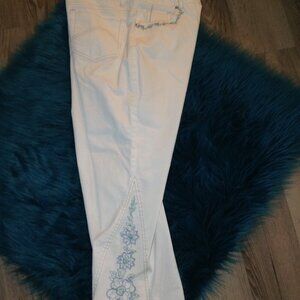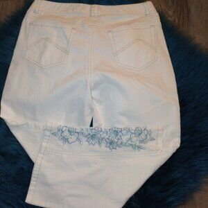 Sigrid Olsen "10" White Denim Capris with Embroidered Details; Boho, Beachcore. These embroidered Capris are so cute. Perfect for a night out or a daytrip to the beach. White with Blue/Aqua/Turquoise Embroidery, Cotton; "Modernist 00", Waist: 17", Inseam 25" No signs of wear; Gently pre-loved