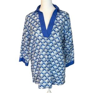 Sigrid Olsen 100% Linen Tunic Blouse Women’s Medium Blue White 3/4 Sleeve Beach