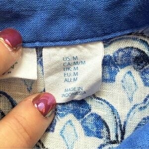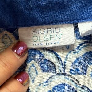 •Style Profile: Sigrid Olsen 100% Linen Tunic Blouse Women’s Medium Blue White 3/4 Sleeve Beach