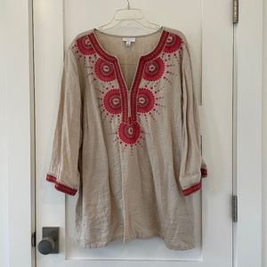 Sigrid Olsen cream color 18W 80% Silk Shell Jacket with snap closure front. Pink black and gold accents creates a great comfortable and stylish piece to go with black pants, dress or skirt. Nice summer weight so not to heavy, wonderfully designed with striated sewn pattern for linear quality.