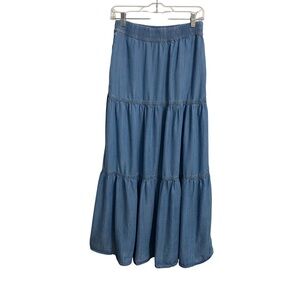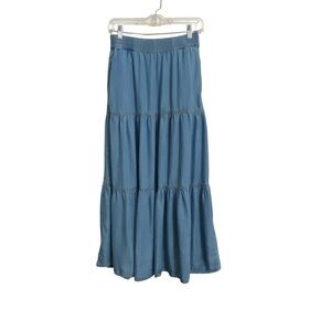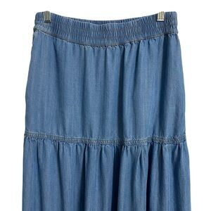 Sigrid Olsen Blue lightweight denim style tiered maxi skirt with side pockets and elastic waist.