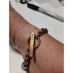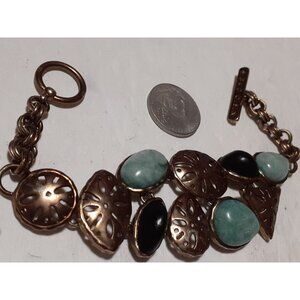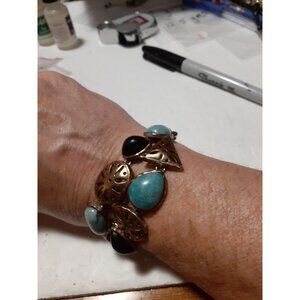 Bronzetone metal with turquoise colored stones. 7-1/2" long and signed on clasp.