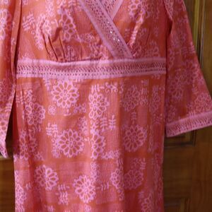 Gently used, pre-owned. This Sigrid Olsen coral pink floral print midi dress brings soft elegance and summer energy in one beautiful piece. The delicate floral pattern in coral hues, combined with a flattering V-neckline and three-quarter sleeves, makes this dress perfect for weddings, parties, or dressy casual occasions. The midi length (approx 42") gives it versatility — wear it with sandals, wedges, or heels and layer with a light cardigan or jacket for cooler evenings.
