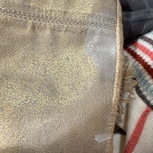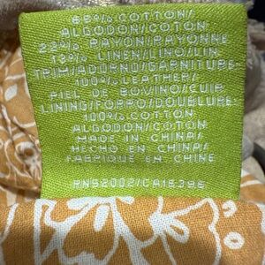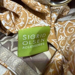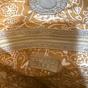 Pen mark inside/ also see bottom photo of bag. A peel and slight discoloration.This Sigrid Olsen shoulder bag in a versatile tan color features a slouchy design, perfect for everyday use. Its medium to large size offers practicality, while the tan leather handles and metallic hardware add a touch of elegance. The bag's neutral tone ensures it complements a wide range of outfits. vacation beach coastal grandma
