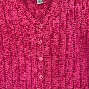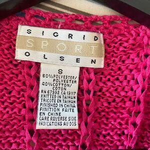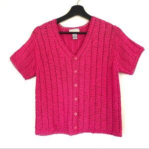 Sigrid Olsen open knit button front sweater top in fuchsia color. Short sleeve and V-neckline. Size Small. Length 20 inches Bust 19 inches. In excellent used condition.