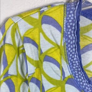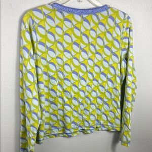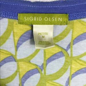 This Sigrid Olsen blouse features a striking green and yellow graphic design, offering a fitted silhouette that enhances your style. The bold pattern and vibrant colors make it a standout piece for any occasion.