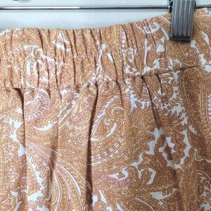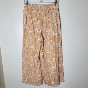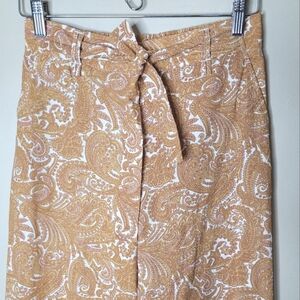 Autumn-ready Sigrid Olsen wide-leg cropped pants in a warm camel/ochre paisley. Linen-rayon blend drapes nicely; flat front with attached tie belt and elastic back waist for comfort. Side pockets. Excellent preowned condition.