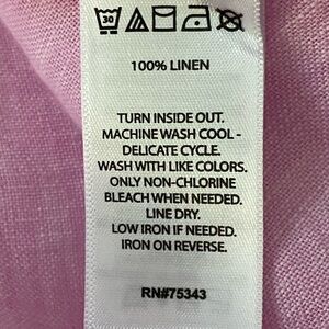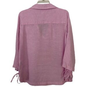 Chic light pink linen top with a V-neck. Features 3/4 sleeves with tie details on the bottom. Ideal for casual or dressy occasions. Excellent preowned condition with no flaws.