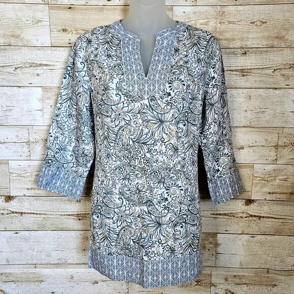 Sigrid Olsen Linen Tunic Top Size Small Tropical Mixed Pattern V-Neck Boho Beach