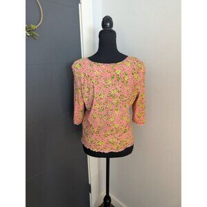 Sigrid Olsen Pink & Green Layered Mesh Lettuce Hem Floral Top - Petite L
