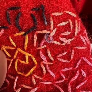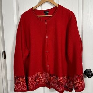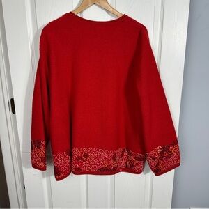 Absolutely beautiful jacket from Sigrid Olsen Sport. Size 3X, 100% Shetland wool. Red with multicolor stitched trim (one minor pull noted in trim). Button front, open cuffs.