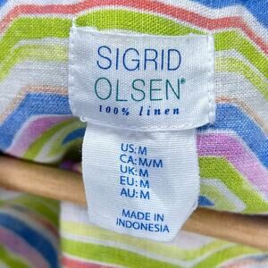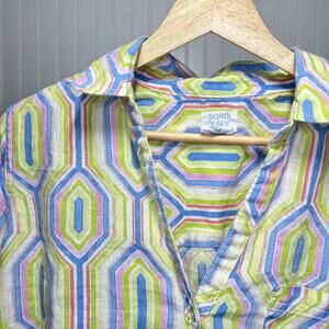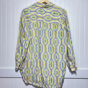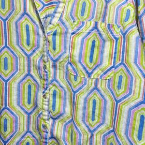 Sigrid Olsen Tunic Linen Whimsy Button Up Vibrant Geometric Hexagon Green Bright