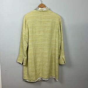 This Sigrid Olsen Collection coat is a must-have for any fashion-forward woman. The yellow-green tweed pattern and boucle fabric type make it a unique addition to your wardrobe. The jacket features a button closure, long sleeves, and is a mid-length coat. It is perfect for travel, casual outings, or workwear. The blazer is lined with silk and has a regular fit, making it comfortable to wear. The vintage style and Y2K theme add a touch of nostalgia to your outfit.