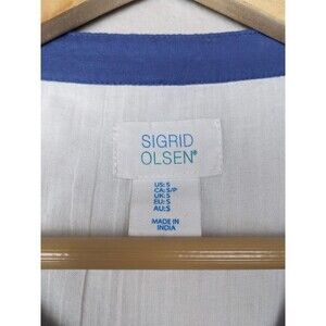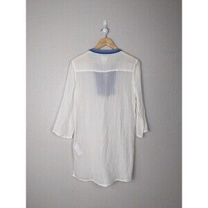 The Sigrid Olsen V-Neck Top in white is a stylish and versatile piece perfect for beach or casual occasions. Made from linen with crochet accents at the neck and sleeves, this tunic-style blouse has a relaxed fit and 3/4 casual sleeves. Machine washable and suitable for summer and spring, this top exudes a boho beach theme and is ideal for women looking for a chic cover-up.
