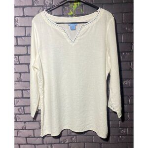Sigrid Olsen White Linen V Neck Tunic with Blue Embroidered Trim L