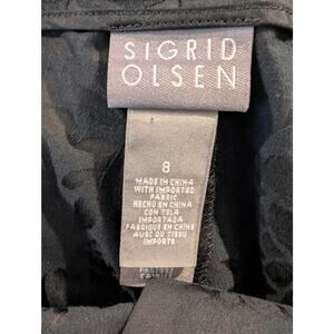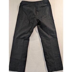 Sigrid Olsen black jacquard slim-fit pants, size 8, featuring an elegant floral textured design. Made from a comfortable stretch blend of 55% cotton, 41% polyester, and 4% spandex, these pants are perfect for formal or semi-formal occasions. Measurements: inseam approximately 27 inches, and rise approximately 10 inches.