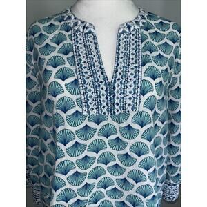 Sigrid Olsen Women’s Tunic Top Size Small Turquoise White Embroidered Fan Print
