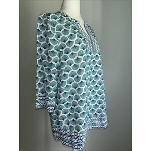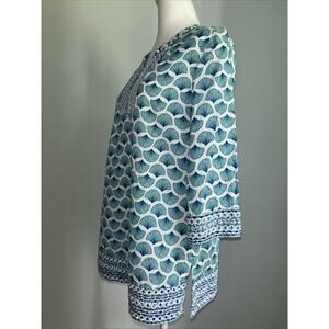 The Sigrid Olsen Women's Tunic Top in size small features a beautiful turquoise and white embroidered fan print, making it a stylish and colorful addition to any wardrobe. This V-neck top has 3/4 sleeves and a pullover closure, with a regular fit and made from 100% cotton material. Beach cover up or tunic. The lightweight and collarless design make it perfect for the summer and spring seasons, with a coastal grandma or preppy theme. Perfect for casual everyday wear, this tunic top by Sigrid Olsen is a versatile and fashionable choice for women looking for a colorful and comfortable blouse option.