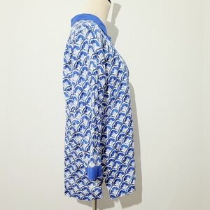 Elevate your wardrobe with this breezy and elegant Sigrid Olsen tunic. Crafted from 100% linen, it features a striking blue and white scallop pattern, deep V-neckline with a solid blue placket, and 3/4 sleeves with matching cuffs. Perfect for casual outings or resort wear, this top blends comfort with timeless style.