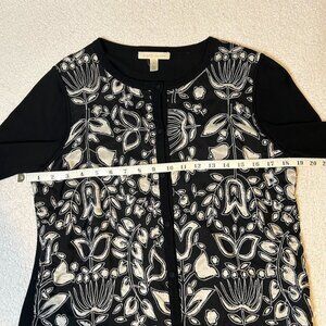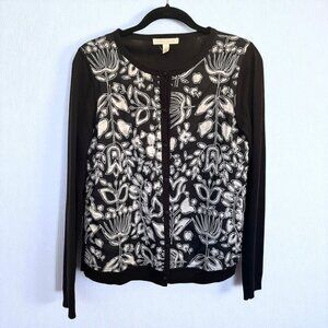 This cardigan sweater has a gorgeous white floral pattern in front to contrast against the black background. It has black covered buttons down the front, with an extra button sewn inside. It is pre-owned and overall in very good condition, without any snags/holes noted.
