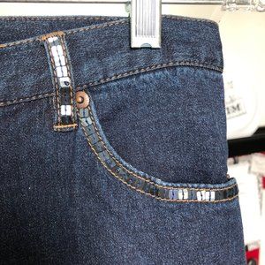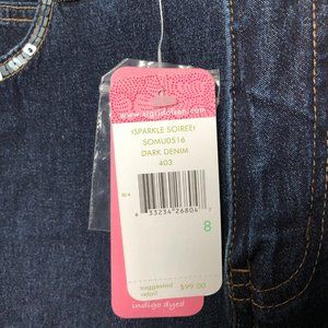 Brand new with tags. These are a size 8 and the waist measures 30". Rise is 11" and inseam is 31". This is a bootcut style, dark wash. Jeans are 97% cotton, 3% spandex and have great stretch. Zipper fly. Jeans have front and back pockets. The style of these is "Sparkle Soiree"--there are sequins sewn onto each belt loop, around the tops of the front pockets, and in the upper right corner of the back right pocket (see pics for details).