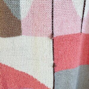 A soft roomy V-neck with amazing asymmetric woven pattern. Great condition with one small issue- see detail. 26" length, 32" chest