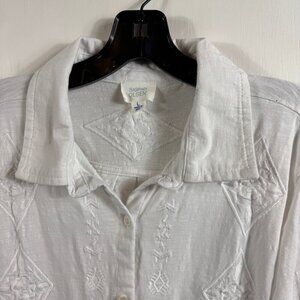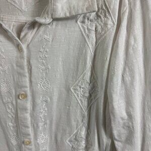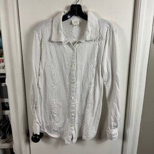 Sigrid Olsen white floral embroidered button up shirt with roll tab sleeves. Size large