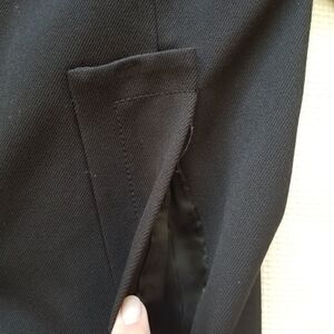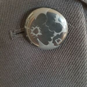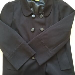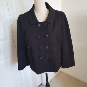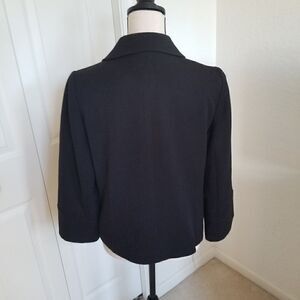 Sigrid Olsen double breasted jacket in black. Hard to find style. Great details and tailoring. Side pockets; completely lined; two extra floral buttons on interior; EUC.