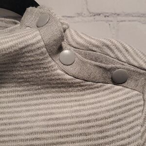 In good used condition overall wear and piling no flaws. Light gray and white stripes. Side slits and cuffed sleeves. Super soft with a button turtleneck.