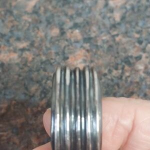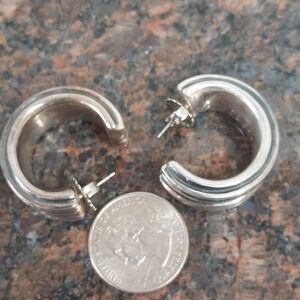 Simon Sebbag earring hoops are stunning, classic, and showy. The other "free" hoops are sterling and classics as well. They are marked 925. The Sebbag earrings and the unknown maker of the smaller hoops are in perfect. condition and probably never worn. The Sebbag earrings' width makes them beautiful and pair just right with the other earring design.