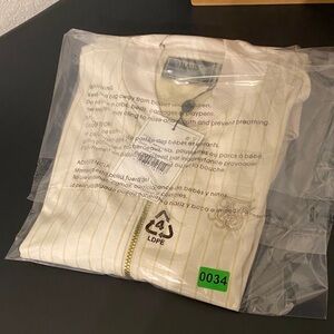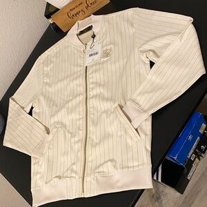 Stylish cream jacket with a sleek pinstripe design. Perfect for any occasion. This new with tags SikSilk jacket is perfect for a night out. Super comfy material nice classy look with the cream jacket tan stripes embroidered logo on left chest and the gold zipper for the cherry on top. Add this to your wardrobe today.