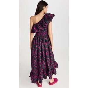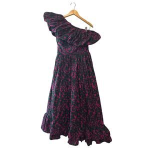 Sika London Green Pink Floral One Shoulder Ruffle Cotton Midi Dress Size 10