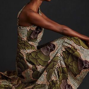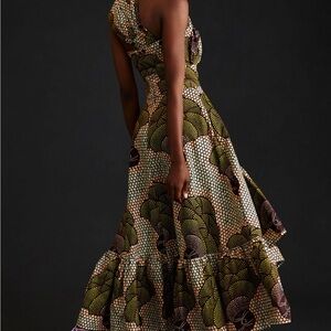 One-shoulder maxi dress with bold green pattern. Fitted bodice flows into a ruffled skirt. Eye-catching print and sculpted silhouette. Stylish choice for formal events.