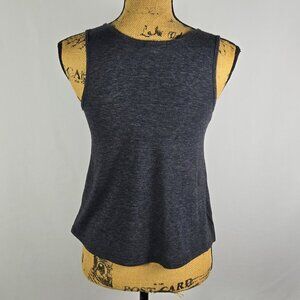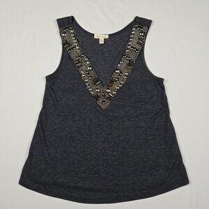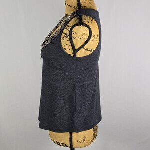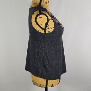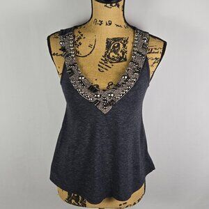 Silence + Noise women’s tank top, size XS. Dark heather gray knit with an intricate silver-tone beaded and studded neckline. Sleeveless, scoop neck, soft poly-cotton-rayon blend. Made in USA. Pre-owned with minimal wear.