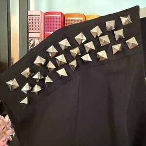 Elegant black jumpsuit with edgy studded shoulder detail. Ideal for versatile styling. Pockets! Layflat measurements: pit to pit 17”, waist 14”, inseam 1”. Size small. 100% polyester