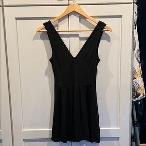 Chic black mini dress with a textured design. Sleeveless with a V-neckline and keyhole back. Perfect for stylish outings.