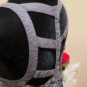 This is a black and grey tank top with a stewpot back that features window pane design.
