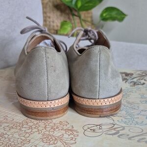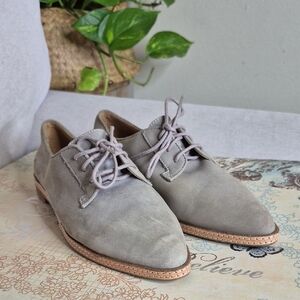 Stylish light gray suede oxfords. Sleek design with lace-up closure. Ideal for formal and casual wear.