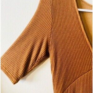 Silence & Noise Ribbed Knit V Neck Dress S Short Sleeve Empire Waist Brown Tan