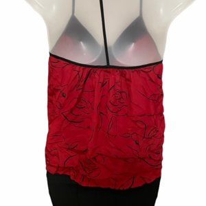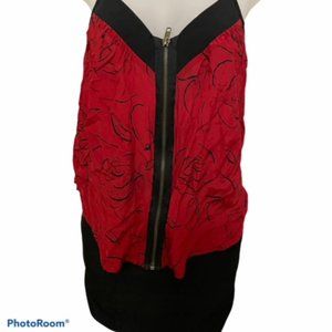 Beautiful red cami, 100% silk, that zips up at the front. Very flowy with a racerback strap. Abstract floral design on the front. Looks great with jeans or skirts. Used.