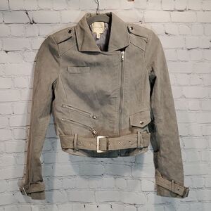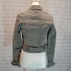 In very good used condition very minor wear. Light gray with silver hardware. Has 4 functional pockets and a zipper closure. Fully lined with an adjustable waist.