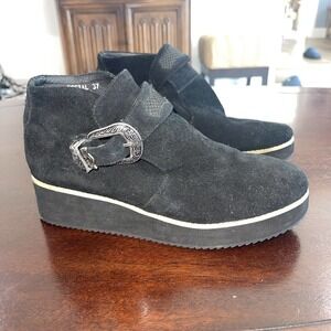 Silent D Anthropologie Cowboy Buckle Bootie Black Suede Boots 37 Platform US 6.5