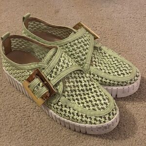 Fashionable green mesh loafers featuring a bold gold buckle. Perfect for everyday style.