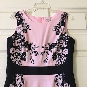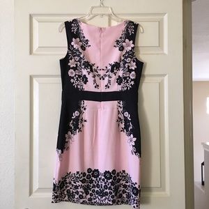 Perfect to wear for Valentine's Day lunch or dinner! Black flowers silhouetted in front of a pale pink background. 97% polyester. Excellent condition.