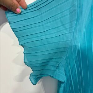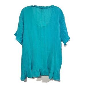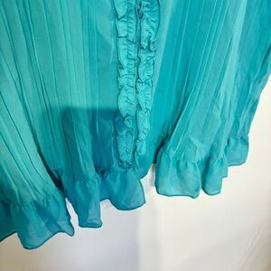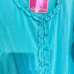 Silhouettes Womens Blouse Top 2X Aqua Blue Pleated Swirl Ruffle Short Sleeve