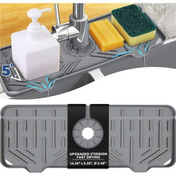 🧿💪【MORE ORGANIZATION】 It's not only a faucet drying mat, it also a sponge holder for kitchen sink, dish soap tray, dish drying mat, kitchen organization, home organizer. For kitchen: put sponge, dish soap, detergent, brush, and bottle on it. Upgrade the size of the increase, you can put more kitchen supplies. Make your sink cleaner. Used as an organizer mat, drain pad. It is a super practical home, bathroom, kitchen gadgets, house rv life apartment must haves!